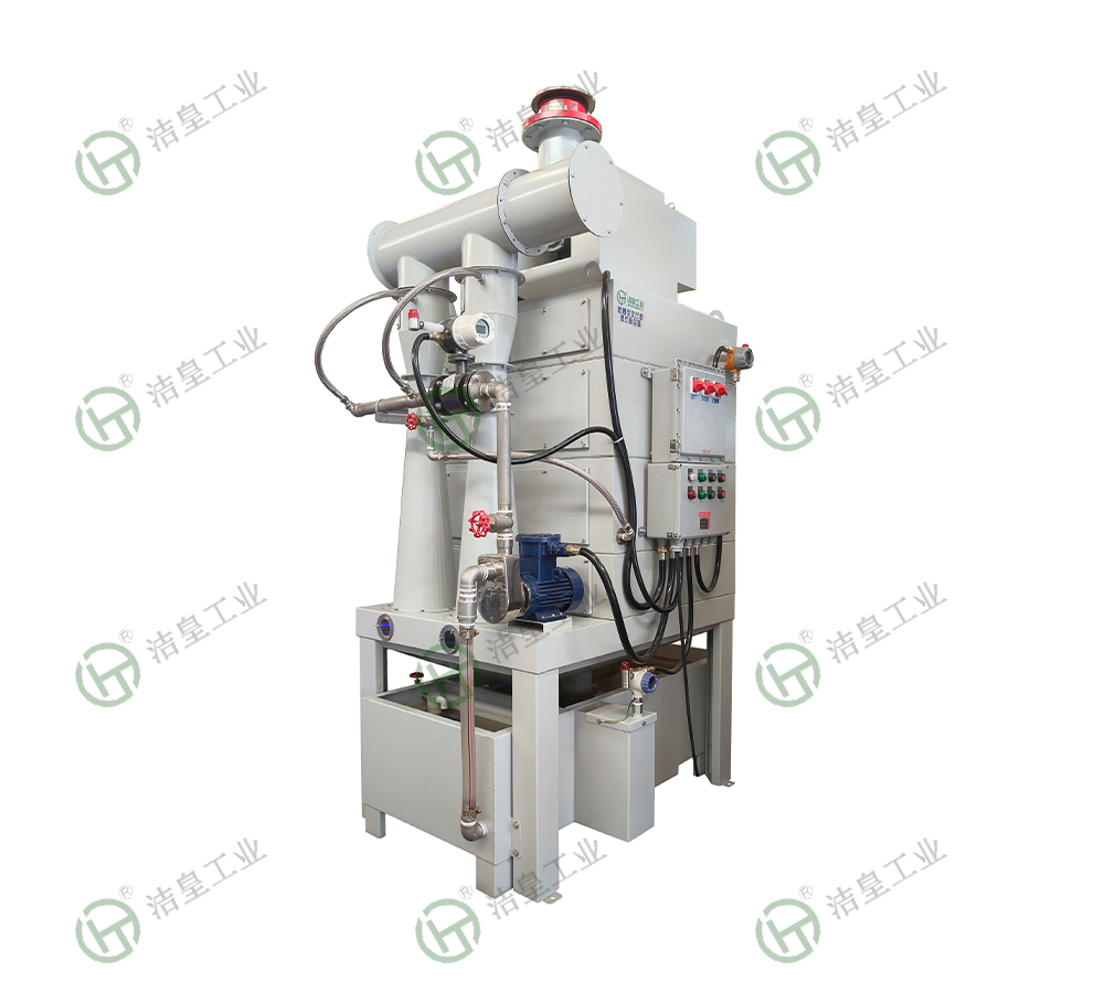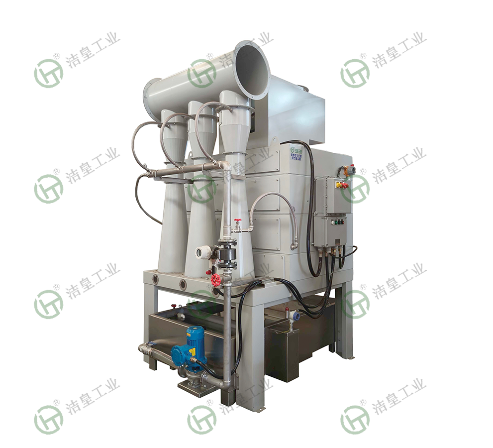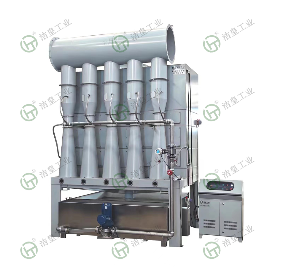 該機利用文丘裏原理和氣相負壓使得噴淋液相形(xíng)成,將吸入(rù)的煙霧,塵埃和廢氣被(bèi)水霧、水漫捕(bǔ)捉吸(xī)附(fù)形成大液滴落入沉(chén)澱池,部分細(xì)沫通(tōng)過初過濾、高效過濾(lǜ)除沫器(qì)浸潤吸附回落(luò)沉(chén)澱池。沉澱池沉澱水供給循環泵(bèng)循環噴(pēn)淋,周(zhōu)而複始,水位由液位器控製,進水(shuǐ)管自動補(bǔ)給(gěi)運作所蒸發的水汽損失。沉澱池底部的淤泥或碎屑可通過撈渣口人工清理或鬥式水箱底部球閥排出。該機過濾單元無堵塞,高沉降分離效率,排出空氣符(fú)合標準。該機模塊化設計組裝,零件噴塑處理,工況需要亦可不鏽鋼製作。粉塵濃度較大時,應加裝旋風濕式除塵器使用,可減輕過濾器壓力和損耗,更好地(dì)保證性能。